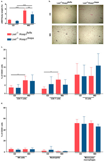 NAFLD is strongly associated with obesity, and inflamed adipose tissue seems to promote the progression to NASH [40].Hepatocytes comprise up to 80% of the total liver cell population and fulfill key functions. In addition to filtering of blood, nutrient uptake, and detoxification of substances such as alcohol, their functions include the secretion of proteins and lipids and the formation of bile [41]. Therefore, the disturbance of hepatocyte functions, e.g., by increased oxidative stress, could potentially affect all of these processes and have an influence on adipose tissue inflammation, which is accompanied by increased immune cell infiltration, and gut microbiota. Thus, we next analyzed the epidydimal white adipose tissue (eWAT), which is one of the main fat deposits of the body. In both mouse strains, WD feeding caused an increased eWAT/body weight ratio when compared to the respective chow fed controls. However, this increase was significantly lower in the Lsel−/−Keap1Δhepa mice (Figure 4a). Obesity is typically characterized by an increase in size and number of adipocytes [42]. The adipocytes in the two WD-fed mice strains were enlarged to a similar degree in comparison to their chow-fed controls. However, in Lsel−/−Keap1flx/flx mice, a stronger infiltration of immune cells was visible (Figure 4b). This was supported by flow cytometric analysis. Whilst there was no striking difference in the numbers of CD45+ cells/g of adipose tissue between the chow-fed mice strains, the number of these cells was higher in WD-fed Lsel−/−Keap1flx/flx mice than in their Lsel−/−Keap1Δhepa counterparts (1.7 × 106 ± 1.6 × 106 cells/g fat of Lsel−/−Keap1flx/flx mice versus 1.14 × 106 ± 5.94 × 105 cells/g fat of Lsel−/−Keap1Δhepa mice). In Lsel−/−Keap1flx/flx mice, WD treatment resulted in a significantly increased frequency of CD4+ and CD8+ T cells, which was not seen in the Lsel−/−Keap1Δhepa mice, while there were no significant differences in the frequencies of B cells or any other of the innate immune cells analyzed. (Figure 4c,d).