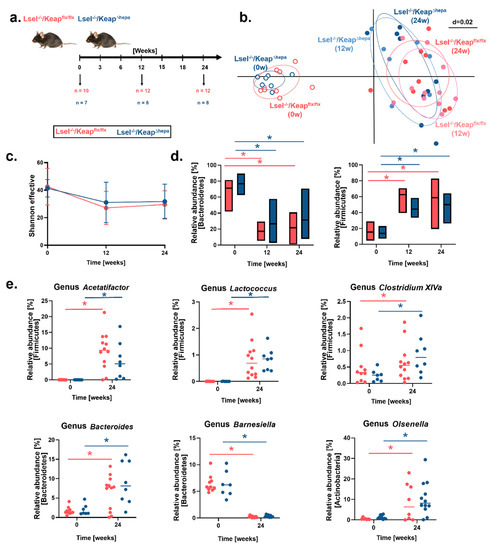 WD feeding causes robust shifts in gut microbiota composition. Lsel−/−Keap1flx/flx mice (shown in red) and Lsel−/−Keap∆hepa mice (shown in blue) were fed for 24 weeks with Western diet (WD). (a) Schematic diagram of the sampling strategy. Fecal samples were collected of Lsel−/−Keap1flx/flx and Lsel−/−Keap∆hepa littermates at the indicated time points. The number of samples (n) has been demarcated under each point. (b) NMDS plot of microbiota profiles based on generalized UniFrac distances from Lsel−/−Keap1flx/flx and Lsel−/−Keap∆hepa mice at different time points. Individual time points that were considered for calculations have been marked within their respective circles. (c) Diversity and composition of the microbiota from different mouse groups. Shown is the Shannon effective count in samples based on time (treatment duration). The diversity of operational taxonomic units (OTUs) within a given sample (alpha-diversity) was calculated in Rhea. (d) Taxonomic binning of fecal microbiota of Lsel−/−Keapflx/flx and Lsel−/−Keap∆hepa mice at the phylum level. (e) Relative abundance of various genera in feces of Lsel−/−Keapflx/flx and Lsel−/−Keap∆hepa mice. In all graphs shown, significance was calculated by non-parametric ANOVA (Kruskal–Wallis Rank Sum Test), * p < 0.05.