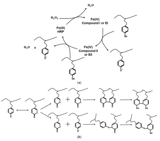(a) Activation of polymer–phenol conjugates in the presence of the HRP enzyme and hydrogen peroxide. (b) Isomerization of phenolic radicals and crosslinking reactions between different types of “live” polymer chains and enolization of crosslinked polymer chains (adapted from reference []).