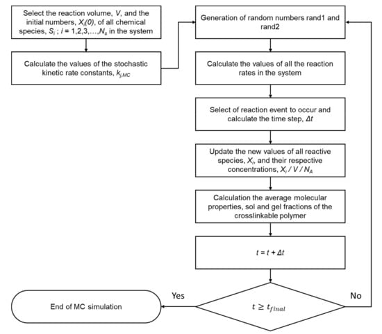 The two main MC approaches that are currently used for the stochastic simulation of the polymerization kinetics are based on the pioneering works of Gillespie [] and Tobita []. Thus, the vast majority of stochastic simulation studies in polymerization are based on these two approaches. The Gillespie approach, known as the stochastic simulation algorithm (SSA), is an exact method that is used to simulate the kinetics of a spatially homogeneous chemical reaction system on the basis of the reaction probability density function [,]. It is known that the Gillespie algorithm is fully equivalent to the master-equation approach []. In spite of the fact that the master-equation approach is exact and elegant; it is usually not very useful for making practical numerical calculations []. Thus, for complex reactive systems (i.e., like the present multidimensional crosslinking system), the Gillespie algorithm is a more efficient and easier to apply method. The SSA is an event driven stochastic method in which different events (i.e., chemical reactions) take place according to the estimated instantaneous probabilities of the relevant chemical reactions while the duration of each time-step, Δt, is calculated on the basis of the cumulative reaction rate of the reactive system [].