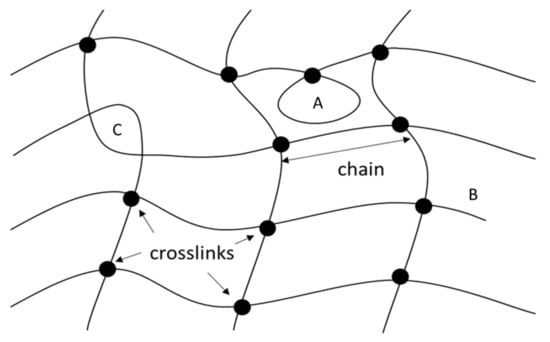 In reality, 3D polymer networks are not ideal and include a number of defects. Flory [] mentioned three types of defects—namely, chain intramolecular crosslinks, chain free or loose ends and chain entanglements (see Figure 3). The term intramolecular crosslinks refers to the crosslinking of two functional groups residing on the same polymer chain, resulting in the formation of a chain loop. In the case that this chain loop has no other intervening crosslinks with other chains in the network, then the loop will not provide any elastic contribution to potential network deformations. The term chain free or loose end refers to chains (i.e., chain segments) having only one of the two ends connected to the network by a crosslink. As a result, this free chain segment does not provide any elastic contribution to the network’s elastic modulus. Finally, the term chain entanglement refers to the reticular or spherical structure formed by the entanglement points formed in a polymer chain or between polymer chains, which limits the polymer chains mobility. This nonchemical connection can be equivalent to a crosslink and, thus, potentially provide an elastic contribution to the 3D polymer network.