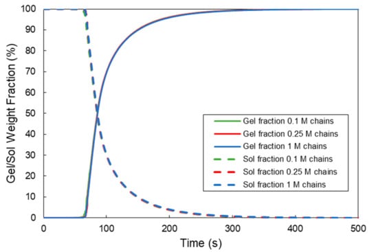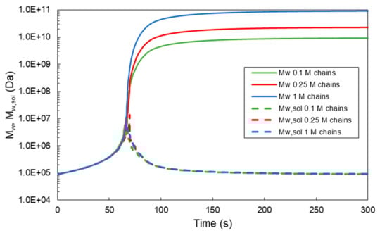 For the determination of the gelation onset time, we follow the time evolution of the weight average molecular weight in the solution. It is well-established that the time at which the Mw shows a very steep increase (i.e., the value of Mw increases by several orders of magnitude) characterizes the gelation onset time and the formation of a 3D polymer network. Thus, the gelation onset time is defined as the time at which the Mw,sol attains a maximum. From that time on, the gel fraction starts increasing while the polymer fraction in the solution decreases as polymer chains from the solution are connected to the growing polymer network. Regarding the calculation of gel and sol fractions in the Monte Carlo-based methods, different approximations have been proposed in the literature [,,]. In the present MC algorithm, the largest polymer chain in the simulated sample is treated as gel, while all the remaining polymer chains in the sample are considered to be in the solution phase [,]. Thus, the molecular weight and the mass fraction of the largest chain and the molecular weight and mass fraction of the remaining chains is bookkept during the whole simulation in order to find the maximum Mw,sol.