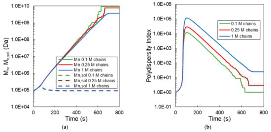 Effect of the initial number of polymer chains on the time evolution of the number of average molecular weights (Mn) in the system and sol phase (Mn,sol) (a) and Polydispersity Index in the system (b) for a HA-Tyr solution (i.e., 1.75% w/v, MW = 90 kDa, 0.124 units/mL HRP and 728-μM H2O2) [].