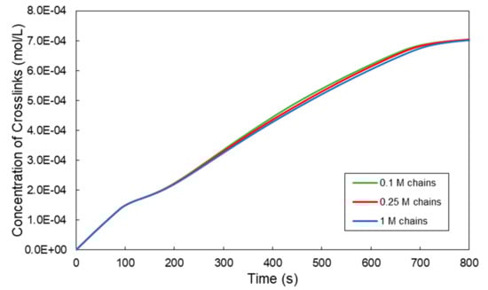At this point, it should be pointed out that one of the main advantages of the present 4D Monte Carlo algorithm is that it can simulate the crosslinking kinetics and evolution of molecular properties and gel and sol fractions before and after the gelation onset time. Moreover, at any time during the simulation, it is possible to know all the molecular structural features of all polymer chains in the system (e.g., concentration of the residual phenol groups), including the crosslinks concentration. From the knowledge of the crosslinks concentration, one can calculate the dynamic evolution of the storage modulus of hydrogel, G′. In Figure 7, the time evolution of the crosslinks concentration is depicted for the crosslinkable Tyr-HA system under investigation. It is evident that the initial sample size does not have any significant effect on the crosslinks concentration.