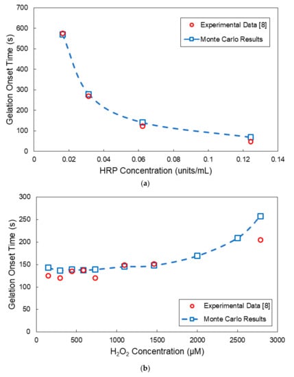 Comparison of the MC model results with reported experimental measurements on the gelation onset time for the HA-Tyr system (i.e., 1.75% w/v, MW = 90 kDa) []: (a) effect of the HRP concentration on the gelation onset time (H2O2 concentration: 728 μM) and (b) effect of the H2O2 concentration on the gelation onset time (HRP concentration: 0.062 units/mL).