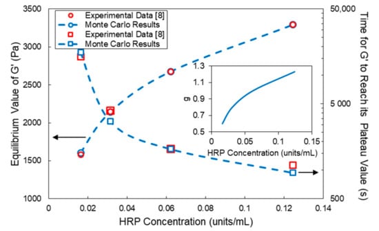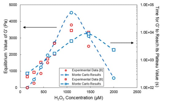 In the following section, the model predictions are compared with experimental measurements on plateau time, plateau storage modulus (G′) and average molecular weight between crosslinks (Mc) for a tyramine modified hyaluronic acid crosslinkable solution []. Moreover, the calculated values for the polymer volume fraction in the swollen state () and mesh size (ξ) are reported for the same system. Finally, model predictions on the dynamic evolution of the storage modulus (G′) are compared with experimental measurements for the HA-Tyr system [].