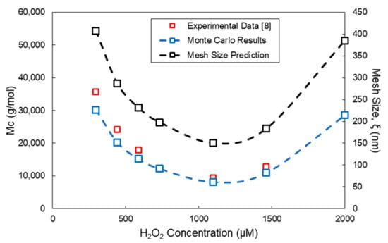 In what follows, the enzymatic crosslinking mechanism for polymer–phenol conjugates in the presence of the HRP/H2O2 initiation system is postulated. In Section 3, a detailed description of the stochastic MC kinetic crosslinking model is presented. In Section 4, the derived dynamic MC model is validated using the experimental results of Lee [] for the tyramine modified Hyaluronic Acid (HA-Tyr) system. The effects of the HPR and H2O2 concentrations on the gelation onset time and the average molecular and viscoelastic properties of the synthesized hydrogels are assessed, and the model predictions are successfully compared with reported experimental measurements []. Moreover, predictions of the hydrogel molecular properties (i.e., average molecular weight between crosslinks, Mc, and hydrogel mesh size, ξ) are presented. Finally, in Section 5, the main conclusions of the present work are summarized.