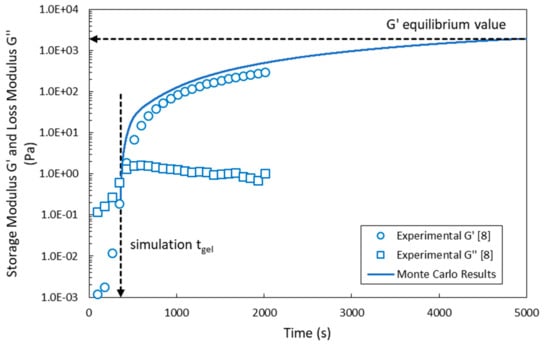 In particular, the relaxation modulus (G) of the hydrogel can be calculated in terms of the MC calculated concentration of crosslinks, vc. Note that the relaxation modulus, G(t), of a crosslinked network, at long times, approaches a nearly constant value, Ge, representing the equilibrium shear modulus, as described by the rubber elasticity theory []. Moreover, the storage modulus of a crosslinkable system, G′(ω), at low frequencies, approaches the same characteristic value of Ge []. According to the fundamental work of Treolar [] on rubber elasticity, the equilibrium shear modulus of an ideal rubber elastic network can be calculated by the following equation:
