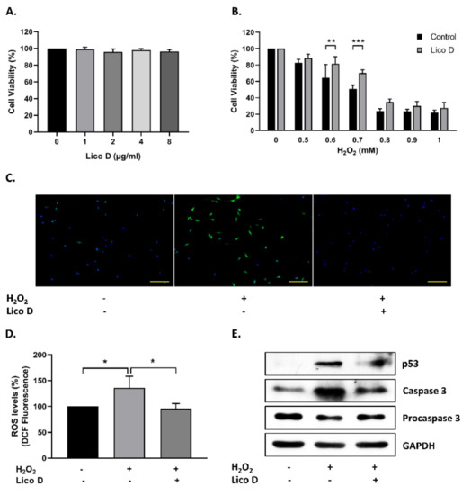 To quantify the production of intracellular ROS, we used cell permeable substrate 2′,7′-dichlorofluorescin diacetate (DCFH-DA), which can be converted to highly detectable fluorescent 2′,7′-dichlorofluorescein upon oxidation. The cells were cultured in 12-well plates and 96-well plates for 24 h. After 24 h of culture, the cells were treated with 1 µg/mL of Lico D for 12 h and incubated with 20 μM DCFH-DA for 30 min. The cells were then washed and incubated with H2O2 (0.7 mM) for 1 h at 37 °C. The cells were then fixed with 4% paraformaldehyde at room temperature for 15 min and the nuclei were stained with Hoechst. Then, the cells were observed under a fluorescent microscope (Nikon Eclipse Ti2; Japan), and the images were captured (Nikon DS-Ri2; Japan) and analyzed using the Image J software. To analyze the apoptotic markers, the cells were pretreated with 1 µg/mL of Lico D followed by incubation with H2O2 (0.7 mM) for 1 h at 37 °C, and then the proteins were isolated as described below.