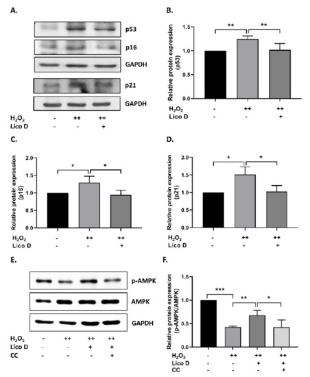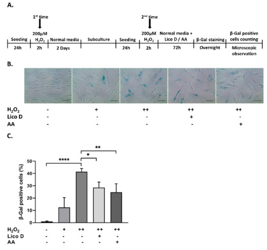 H2O2 was used to induce oxidative stress-induced cell cycle arrest and senescence as described previously [9,44] with some modifications (Figure 2A). Briefly, the cells were exposed to 200 µM H2O2 for 2 h and cultured for 2 d without H2O2. In the second treatment with H2O2, the cells were split 1:3, exposed to 200 µM H2O2 for 2 h, and cultured with either normal media (control), Lico D (1 µg/mL), ascorbic acid (500 µM AA; a positive control), or the compound C (0.5 µM; AMPK inhibitor) for 72 h. Cellular senescence was confirmed by SA-β-gal assay and Western blotting as described below.