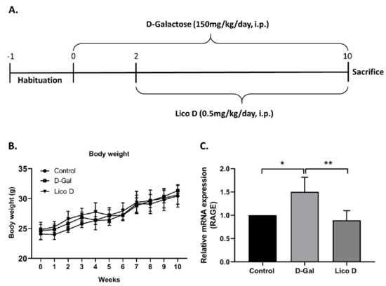 Lico D reduces receptors for advanced glycation end products (RAGE) expression in D-Galactose treated mice. (A) Schematic representation of the experimental plan and (B) body weights of the mice. (C) Relative fold changes in mRNA of RAGE was quantified by quantitative reverse transcription-polymerase chain reaction (qRT-PCR). All data are represented as mean ± SD (n = 4). * p < 0.05 and ** p < 0.01.