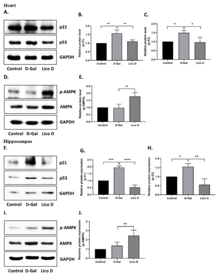 Oxidative stress can activate cellular senescence through various signaling cascades, but ultimately activate p53, p16, or both, and mediate cell cycle arrest [39,40]. Therefore, we first examined the expression of senescence markers p53 and p21 in the heart and hippocampus tissues. As expected, the expression levels of p53 and p21 were upregulated in D-Gal-injected mice compared to those in the vehicle (Figure 6A–C heart, and F-H hippocampus). More importantly, their expression was significantly reduced in the Lico D-treated group. These data suggest that Lico D ameliorates heart and hippocampal senescence in D-Gal-induced aging mice. Next, we analyzed the effect of Lico D on AMPK activation in the heart and hippocampus. There were no significant changes in the AMPK levels in the heart and hippocampus tissues of D-Gal-treated mice (Figure 6D,E hearts; and I and J hippocampus). However, when compared to the D-Gal treatment, AMPK activation was significantly increased in both tissues of Lico D. These results suggest that Lico D reduces senescence by activating AMPK in D-Gal-induced aging mice.