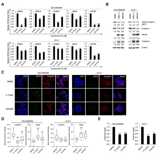 TI-12403 stabilizes AXIN2 and downregulates β-catenin signaling in COLO320DM and DLD-1 cells. Human colorectal cancer (CRC) COLO320DM and DLD-1 cells were treated with 10 μM of each TI compound for 24 h. (A) mRNA expression levels of the indicated β-catenin target genes (AXIN2, BIRC5, CCND1, cMYC, and FGF20) were quantified using quantitative polymerase chain reaction (qPCR). XAV939 was used as a reference control. Data represent the mean ± standard deviation (SD) of three independent experiments. * p < 0.05, ** p < 0.01, *** p < 0.001 versus respective DMSO-treated cells. (B) Whole cell lysates were subjected to immunoblotting for detection of active β-catenin (ABC), total β-catenin, TNKS1/2, and AXIN2. β-actin was used as a loading control. The density of each band was measured by Image J software and normalized to that of β-actin. Data represent the mean ± SD of three independent experiments. * p < 0.05, ** p < 0.01 versus respective DMSO-treated cells. (C) COLO320DM and DLD-1 cells were treated with 10 μM TI-12403 and immunostained for AXIN2 (green) and β-catenin (red). Nuclear DNA was counterstained with DAPI (blue). Scale bar, 20 μm. (D) Quantification of the mean fluorescence intensity in Figure 1C. * p < 0.05, ** p < 0.01, *** p < 0.001 versus corresponding cells. (E) COLO320DM and DLD-1 cells were transfected with either TOP- (wild-type TCF binding sites) or FOP- (mutated TCF binding sites) flash reporter plasmid and then treated with 10 μM TI-12403 for 48 h. Transcriptional activity was measured with a luciferase reporter assay system and was calculated by dividing the TOP ratio by the FOP ratio (TOP/FOP ratio). Data represent the mean ± SD of three independent experiments. *** p < 0.001 versus respective DMSO-treated cells.
