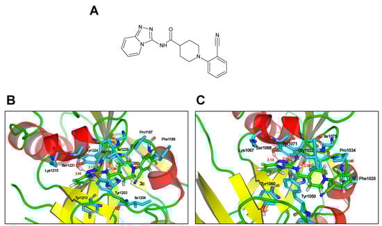 Several TNKS inhibitors have a triazolopyridazine functional group or a dihydrothiazolotriazole group with an X-ray crystal structure [23,24]. We superimposed the released TNKS1 X-ray crystal structure (PDB code: 4KRS) with the dihydrothiazolotriazole complex structure for TI-12403 (Figure 2A,B). The Ser1221 side chain of hydroxyl forms a hydrogen bond with triazololpyridine, and the Gly1185 backbone chain oxygen forms a hydrogen bond with the triazololpyridyl group. The amide linker of TI-12403 also forms a hydrogen bond with the carbonyl oxygen of Gly1185. Additional hydrophobic interactions exist between the cyanophenyl ring of TI-12403 and the binding pocket involving Pro1187, Phe1188, and Ile1204 of TNKS1. In case of the docking position between TI-12403 and TNKS2 (PDB code: 3P0Q), the amide linker of TI-12403 forms two hydrogen bonds with carbonyl oxygen and NH hydrogen of Gly1032 (Figure 2C). However, the Ser1068 side chain of hydroxyl does not form a hydrogen bond with triazolopyridine at the intermolecular distance 3.14 Å. Our docking studies suggested that TI-12403 bound to both the nicotinamide pockets of TNKS1 and TNKS2. The IC50 value of TNKS1 and TNKS2 is shown in Table 1.