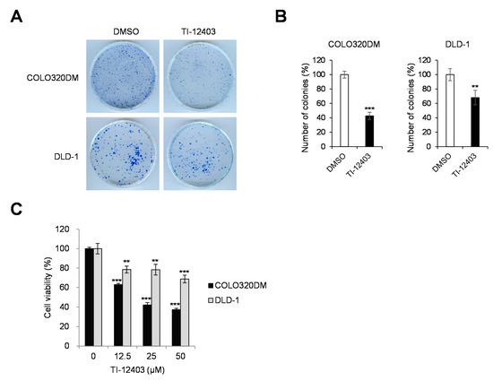 TI-12403 inhibits the growth of adenomatous polyposis coli (APC)-mutated colorectal cancer (CRC) cells. (A) COLO320DM and DLD-1 cells were treated with 10 μM TI-12403 and then incubated for 14 days. Colonies with more than 50 cells were counted. (B) Colony formation assay results presented as bar graphs showing the number of colonies. The bar graph represents the normalized values to control group. *** p < 0.001, ** p <0.01 compared to vehicle controls. (C) COLO320DM and DLD-1 cells were incubated with TI-12403 at the indicated concentrations. Cell viability was determined by MTT assay 72 h after treatment. ** p < 0.01, *** p < 0.001 compared to respective DMSO-treated cells.