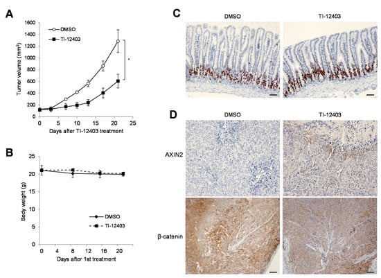 TI-12403 suppressed the growth of DLD-1 xenograft tumors in nude mice. (A) DLD-1 cells were subcutaneously injected into the thigh of the right hind leg of BALB/c nu/nu mice (n = 4 per group). One week after tumor cell injection, TI-12403 (20 mg/kg) or DMSO (control) was intraperitoneally administered once per day for 14 days. The longest (L) and shortest (W) tumor axes were measured, and tumor volume (mm3) was calculated as L ×W2/2. The data shown represent the average tumor volume (* p < 0.05). (B) Body weights of DLD-1 tumor xenograft mice were determined once weekly during the experiments. (C,D) Xenograft tumors and small intestines in each group were harvested and extracted completely after 21 days. (C) Small intestine sections from TI-12403- or DMSO-treated DLD-1 xenograft mice were immunohistochemically stained with the cell proliferation marker Ki67 (brown). Scale bar, 100 μm. (D) Immunohistochemical staining of β-catenin and AXIN2 (brown) in tumor tissues. Scale bar, 100 μm.