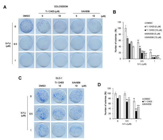 5-fluorouracil (5-FU) is commonly used in chemotherapy for patients with advanced CRC [26,27]. We evaluated whether treatment with a combination of 5-FU and TI-12403 produced synergistic effects. COLO320DM and DLD-1 cells were treated with the indicated concentrations of TI-12403 and 5-FU, and cell viability was assessed using a colony formation assay. Compared to TI-12403 or 5-FU treatment alone, combination treatment showed a stronger synergistic effect than XAV939 in COLO320DM (Figure 5A,B) and DLD-1 cells (Figure 5C,D). These results indicated that TI-12403 and 5-FU combination treatment synergistically inhibited COLO320DM and DLD-1 cell growth.