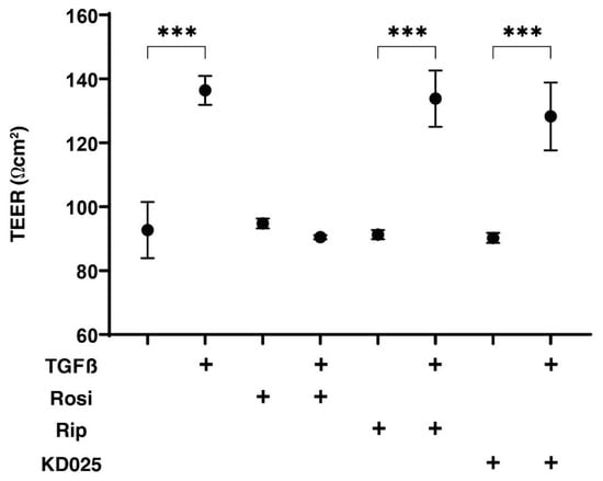 As shown in Figure 1, in the presence of a 5 ng/mL TGF-β2, the TEER value of 2D cultured HconF cell monolayers was significantly increased, while in contrast, the stimulation of PPARγ by rosiglitazone (Rosi) or the inhibition of ROCKs by pan-ROCK-i, Rip, or the selective ROCK2 inhibitor, KD025 did not induce any changes. Interestingly, these TGF-β2-induced increased TEER values were substantially inhibited by Rosi, but were not affected by Rip, or KD025. Thus, these data suggest that Rosi may inhibit the TGF-β2-induced increase in the fibrogenetic changes of the 2D cultured HconF monolayers.