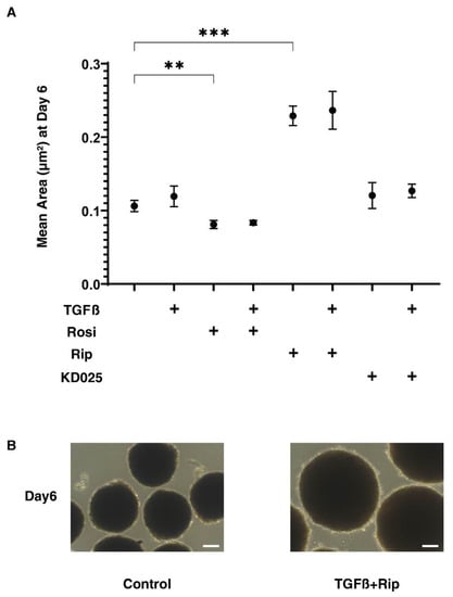 Figure 2. Mean sizes of 3D HconF organoids in the absence or presence of TGFβ2 and/or rosiglitazone, ripasudil or KD025.The following eight experimental groups included: (1) control for (2), (2) treated with 5 ng/mL TGF-β2 (TGFβ), (3) treated with 10 μM rosiglitazone (Rosi); control for (4), (4) treated with TGFβ and Rosi, (5) treated with 50 μM ripasudil (Rip); control for (6), (6) treated with TGFβ and Rip, (7) treated with 50 μM KD025; control for (8) and (8) treated with TGFβ and KD025.Mean sizes of 3D HconF organoids at Ddy 6 were measured and plotted (panel A). All experiments were performed in triplicate using fresh preparations consisting of 16 organoids each. Representative phase contrast images of control and TGFβ and Rip at day 6 are shown in (panel B) (scale bar: 100 μm). Data are presented as the arithmetic mean ± standard error of the mean (SEM). ** p < 0.01, *** p < 0.005 (ANOVA followed by a Tukey’s multiple comparison test).