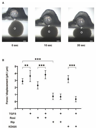 Figure 3. Physical stiffness of 3D HconF organoids in the absence or presence of TGFβ2 and/or rosiglitazone, ripasudil or KD025. The following eight experimental groups included: (1) control for (2), (2) treated with 5 ng/mL TGF-β2 (TGFβ), (3) treated with 10 μM rosiglitazone (Rosi); control for (4), (4) treated with TGFβ and Rosi, (5) treated with 50 μM ripasudil (Rip); control for (6), (6) treated with TGFβ and Rip, (7) treated with 50 μM KD025; control for (8) and (8) treated with TGFβ and KD025. Physical solidity of their 3D HconF organoids at day 6 were analyzed by a micro-squeezer (panel (A), S; pressure sensor, P; pressing plate, O; HconF organoid, scale bar: 100 µm), and requiring force to 50 % deformity of single organoid during 20 s were plotted in panel (B). All experiments were performed using 10 organoids freshly prepared each. ** p < 0.01, *** p < 0.005 (ANOVA followed by a Tukey’s multiple comparison test).