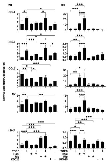 Figure 4. mRNA expression of ECMs of 2D and 3D cultured HconF cells in the absence or presence of TGFβ2 and/or rosiglitazone, ripasudil or KD025. The following eight experimental groups included: (1) control for (2), (2) treated with 5 ng/mL TGF-β2 (TGFβ), (3) treated with 10 μM rosiglitazone (Rosi); control for (4), (4) treated with TGFβ and Rosi, (5) treated with 50 μM ripasudil (Rip); control for (6), (6) treated with TGFβ and Rip, (7) treated with 50 μM KD025; control for (8) and (8) treated with TGFβ and KD025. Each 2D and 3D HconF cells at day 6 was subjected to qPCR analysis to estimate the expression of mRNA in ECMs (COL1, COL4, COL6 or FN). All experiments were performed in duplicate using fresh preparations consisting of a single well out of 12 wells of the culture dish (2D) or 16 organoids each. Data are presented as the arithmetic mean ± the standard error of the mean (SEM). * p < 0.05,** p < 0.01, *** p < 0.005 (ANOVA followed by a Tukey’s multiple comparison test).