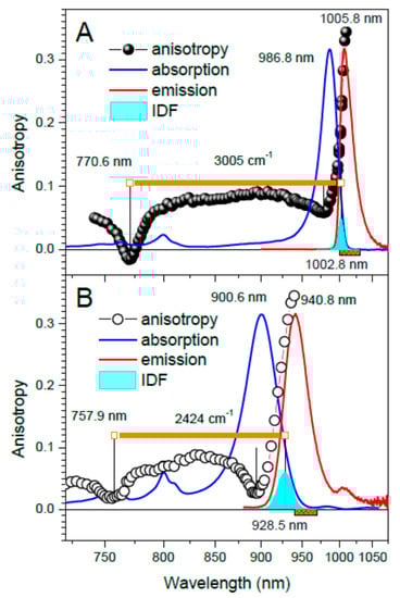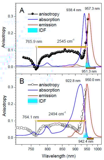 The high resolution in Trv. 970 facilitated by the extra strong exciton coupling allowed for an exciting foresight. In ref. [4], a weak band around 770 nm was resolved in the fluorescence excitation spectrum of Trv. 970, originally related to the vibrational sideband of BChls. However, this interpretation is rather unlikely, because of the proved strong suppression of vibrational sidebands by exciton delocalization [23,24]. To our view, this feature corresponds to the anticipated weak exciton absorption at the top of the LH1 exciton band. This recognition promotes the status of fluorescence excitation spectroscopy as a valuable tool for studying photosynthetic excitons. From another side, the close coincidence observed between the spectral positions of the high-energy anisotropy dip (shown in Figure 1A) and the 770-nm excitation spectrum feature (measured in ref. [4]) validates the former as a reliable measure of the location of the exciton band top.