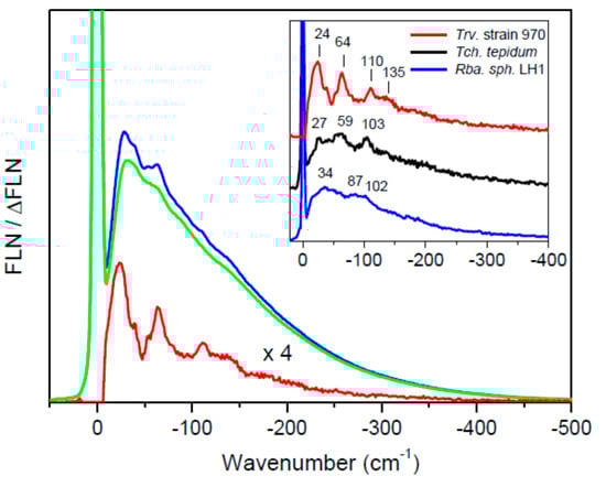 - Rätsep, M.; Freiberg, A. Resonant emission from the B870 exciton state and electron-phonon coupling in the LH2 antenna chromoprotein. Chem. Phys. Lett. 2003, 377, 371–376. [Google Scholar] [CrossRef]