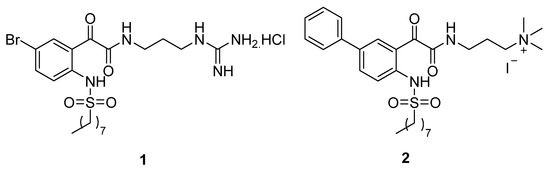 In our previous studies, we reported phenylglyoxamide- and biphenylglyoxamide-based small molecular antimicrobial peptidomimetics 1 and 2 (Figure 1) with high antibacterial activity against Staphylococcus aureus, with minimum inhibitory concentration (MIC) values of 12 and 16 μM, respectively [50,51]. Moreover, peptidomimetic 2 also showed a good MIC value of 32 μM against Escherichia coli. The hydrophobic octanesulfonyl group was found to be important for antibacterial activity, as potency was lost when the chain was shortened.