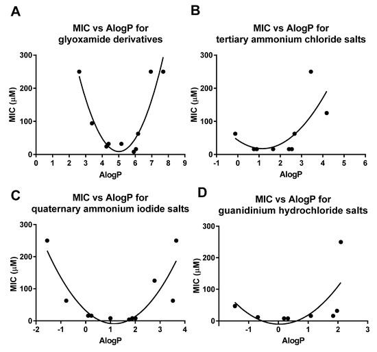 MIC vs. AlogP plot for (A) glyoxamide derivatives; (B) tertiary ammonium chloride salts; (C) quaternary ammonium iodide salts; and (D) guanidinium hydrochloride salts.