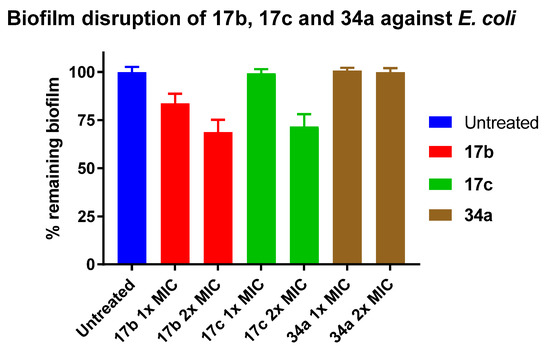 Percentage remaining E. coli biofilms following 24 h treatment with peptidomimetics 17b, 17c and 34a at 1× and 2× MIC. Error bars represent the standard error of triplicates (n = 3).
