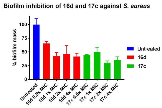 Inhibition of biofilm fomration of S. aureus by peptidomimetics 16d and 17c at 0.5×, 1×, 2× and 4× MIC. Error bars represent the standard error of triplicates (n = 3).