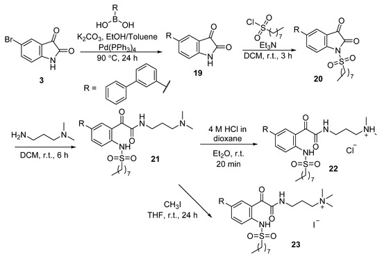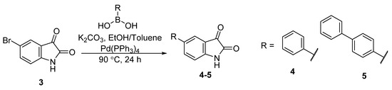 To incorporate the biphenyl or terphenyl group into the phenylglyoxamide backbone, 5-bromoisatin 3 was reacted with phenylboronic acid or 4-biphenylboronic acid with a catalytic amount of tetrakis(triphenylphosphine)palladium(0) via Suzuki–Miyaura cross-coupling reaction to give 5-phenylisatin 4 and 5-(biphenyl-4-yl)isatin 5 in good yields of 86% and 78%, respectively (Scheme 1) [51,56].