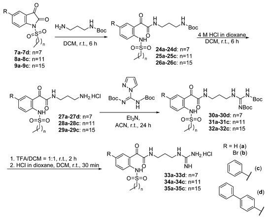 As previous studies have reported that the introduction of a guanidine as the cationic group could increase the potency of peptidomimetics against Gram-positive S. aureus [50,57], the guanidinium hydrochloride salts 33–35 were also synthesised (Scheme 4). To achieve this, N-sulfonylisatins 7–9 were ring-opened with N-Boc-1,3-propanediamine to afford the Boc-protected glyoxamides 24–26 in excellent yields of 88–98%. The Boc-protecting group was then cleaved by treatment with 4 M HCl in dioxane to give the corresponding aminoglyoxamides 27–29 in yields of 60–95%. The guanidine moiety was then introduced to the molecule by reacting the aminoglyoxamides 27–29 with N,N′-di-Boc-1H-pyrazole-1-carboxamidine in the presence of triethylamine in acetonitrile (ACN) to give the Boc-protected guanidine glyoxamides 30–32 in yields of 51–87%. Finally, the Boc-protecting group was cleaved with trifluoroacetic acid in DCM, followed by anion exchange reaction with 4 M HCl in dioxane to give the guanidinium hydrochloride salts 33–35 in 48–97% yield.