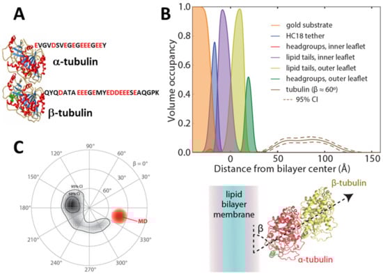 Structural properties of solubilized dimeric tubulin. (A) Crystal structure of tubulin (PDB ID: 1TUB) with the sequences of α1 and β3 C-terminal tails. (B,C) Orientation of peripherally membrane-bound tubulin as determined by neutron reflectometry and molecular dynamics simulations. (B) Volume occupancy of the molecular components of the lipid bilayer (filled curves) and membrane-bound tubulin described by Euler rotations of the crystal structure. The solid line shows the median volume occupancy of tubulin; the dashed lines show the 95% confidence interval. (C) Orientation plot of the Euler angles describing the rotation of the crystal structure to match the measured structure on the lipid surface. Both neutron reflectometry and molecular dynamics (MD) show an angle β between the dimer axis and the lipid surface of approximately 60°. CI = confidence interval. Adapted with permission from Hoogerheide et al., Proc. Natl. Acad. Sci. USA (2017). Copyright (2017) National Academy of Sciences.