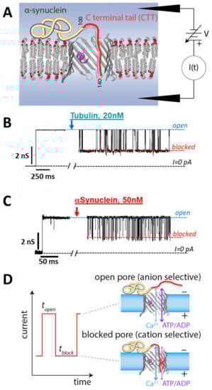 Finally, evidence that the CTT of tubulin or αSyn is captured inside the pore, driven there by the negative voltage, was obtained in experiments where VDAC was reconstituted in a salt gradient. It was shown that the tubulin-blocked state has reversed, cationic selectivity, in comparison to the anion-selective open state []. This arises because the highly negatively charged tubulin CTT, by entering a net positive pore, reverses the net charge of the pore interior. The selectivity of the αSyn-blocked state is more complex, with the selectivity of the blocked state depending on which part of the αSyn molecule is trapped inside the pore at a given time [,]. On average, the selectivity of the αSyn-blocked state is also reversed, but it is less cation-selective than that of the tubulin-blocked state.