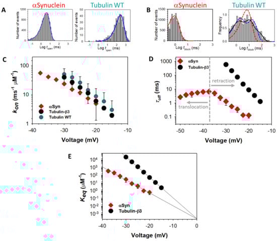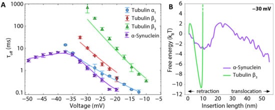 For both proteins, increased applied negative voltage keeps the anionic CTT inside the pore longer. This notion is supported by experiments that show that the blockage time—the time when the channel is blocked by tubulin or αSyn CTT (tblock in Figure 4D)—is highly voltage-dependent and increases exponentially with the applied voltage for both inhibitors. This feature will be discussed in detail in Section 3.