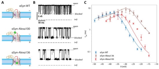 An illustration of the effects of PTMs is shown in the model case where Alexa Fluor 488 was covalently attached to αSyn (Figure 8A,B). The relatively bulky sidechain of Alexa Fluor 488 introduces an entropic barrier to capture and release as well as adding two negative charges to the αSyn CTT. These modifications profoundly affect the release dynamics [], leading to longer blockage times and an onset of translocation at lower voltages (Figure 8C).