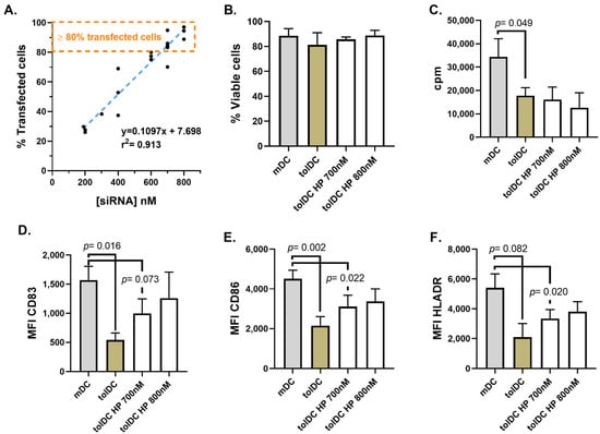 HiPerfect (HP) transfection of monocytes after maturation stimulus using 700 nM and 800 nM of siRNA. Linear regression between the percentage of transfected cells and the concentration of red-labeled non-targeting siRNA (siGLO, negative and red-labeled siRNA control) used (A). Characterization of control untreated mDC and VitD3-tolDC, and VitD3-tolDC obtained following HP transfection using 700 nM and 800 nM of siRNA by analyzing their viability (B), functionality (ability to induce allogeneic PBMC proliferation using a ratio of DC/PBMC of 1/20) (C), and phenotype (mean fluorescence intensity, MFI, of CD83 (D), CD86 (E) and HLA-DR (F) molecules). Data shown as mean + SEM. For all group n = 4, except for tolDC HP 800 nM in which n = 3.