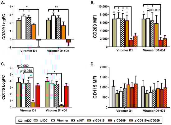 Down-modulation of CD115 and CD209 expression. Analysis of gene and protein expression of CD209 (A,B) and CD115 (C,D) by using specific siRNA + ViroB treatment of VitD3-tolDC on day 1 (D1) or on day 1 + day 4 (D1 + D4) of culture differentiation. Data shown as mean + SEM. n = 3 for all groups. Data of gene expression are referred to mDC and showed as logarithm in base 2 of fold change (FC). Graph B displays only statistical differences between siCD209 and the rest of the tolDC conditions. MFI: mean fluorescence intensity. * p < 0.05; ** p < 0.01.