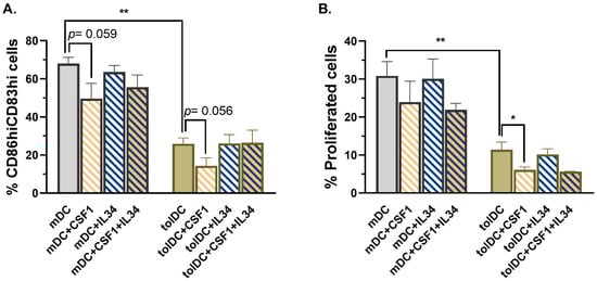 To further analyze the role of CD115 (CSF1R) and its ligands, CSF1 and IL34, mDC and VitD3-tolDC were cultured in the presence of CSF1, IL34 or both during their differentiation (day 0 and 4 of culture). Results obtained revealed that CSF1, but not IL34, increased tolerogenic characteristics of mDC and VitD3-tolDC, although statistical differences were not reached in all the comparisons (% CD83hi CD86hi cells = mDC: 68.02 ± 7.36 vs. mDC + CSF1: 49.56 ± 18.07, p = 0.059; and VitD3-tolDC: 25.94 ± 6.74 vs. VitD3-tolDC + CSF1: 14.34 ± 9.45, p = 0.056) (Figure 5A) (% of alloproliferation = mDC: 30.86 ± 8.42 vs. mDC + CSF1: 23.94 ± 12.33, p = 0.109; and VitD3-tolDC: 11.40 ± 4.57 vs. VitD3-tolDC + CSF1: 6.16 ± 1.63, p = 0.029) (Figure 5B). In addition, cells cultured with CSF1 + IL34 did not show an increased tolerogenic phenotype (% CD83hi CD86hi cells = mDC + CSF1: 49.56 ± 18.07 vs. mDC + CSF1 + IL34: 55.70 ± 8.91; and VitD3-tolDC + CSF1: 14.34 ± 9.45 vs. VitD3-tolDC + CSF1 + IL34: 26.40 ± 9.48) (Figure 5A) and functionality was similar but not higher than that found in cells treated only with CSF1 (% of alloproliferation = mDC + CSF1: 23.94 ± 12.33 vs. mDC + CSF1 + IL34: 21.92 ± 2.38; and VitD3-tolDC + CSF1: 6.16 ± 1.63 vs. VitD3-tolDC + CSF1 + IL34: 5.68 ± 0.02) (Figure 5B).