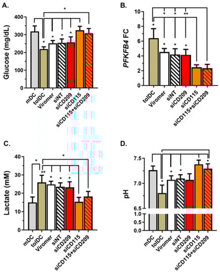 None of these metabolic-related parameters were found altered in VitD3-tolDC treated with siCD209 (Figure 6). However, double transfection of VitD3-tolDC with siCD115 and siCD209 exhibited the same activation level of PFKFB4 gene as siCD115-VitD3-tolDC and similar concentrations of glucose and lactate, as well as pH in culture supernatants (Figure 6), although statistical differences were reached only for PFKFB4 gene expression in siCD115 + siCD209 compared to the VitD3-tolDC and siNT control groups (PFKFB4 FC: VitD3-tolDC: 6.41 ± 2.56 and siNT: 4.19 ± 1.57 vs. siCD115 + siCD209: 2.34 ± 1.04, p = 0.043 and p = 0.014, respectively) (Figure 6B).