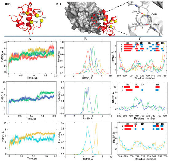 Conventional MD simulations of KID. (Top panel) Structural models of the cleaved KID (KIDC) (left) and KID fused to KIT (KIDD) (middle) in which the N- and C-ends are stabilised by pairs of H-bonds (right). Proteins are displayed as ribbons (KID), surface-filled model (kinase domain), yellow balls (the tyrosine residues) and sticks (residues formed H-bonds). Columns (A–C) show the statistical descriptors of KIDC (top), KIDD (middle) and KIDCR (bottom) computed on the all Cα-atoms of KID for MD conformations of each trajectory after fitting on initial conformation. (A) RMSDs, (B) probability distributions of the RMSDs, and (C) RMSFs computed on the Cα atoms after fitting on initial conformation. In the insert, the folded secondary structures, αH- (red) and 310-helices (blue), labelled as H1–H6, were assigned for an average conformation of each MD trajectory. In (A–C), MD replicas are distinguished by colour: 1–4 of KIDC are in green, yellow, blue, and red; 1–2 of KIDD are in green and blue; 1–2 of KIDCR are in blue light and yellow respectively.