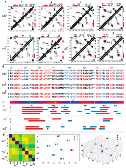 Heterogeneous KID conformations were analysed with the ensemble-based clustering using the RMSD criterion [24]. To better grasp the conformational diversity of each studied KID entity, the conformations were clustered with the RMSD threshold = 3, 4 and 5 Å. With r of 4 Å, we obtained a reasonably limited number of clusters regrouping almost all the conformations generated on each trajectory (Figures S2–S4). Since some clusters’ representative conformations of different replicas showed striking similarity, we suggest that the conformational spaces generated by the independent trajectories of each KID entity partially overlap. Clustering analysis of the merged (concatenated) trajectory with the same RMSD threshold ( = 4 Å) produced the number of clusters which is less than a sum of clusters obtained for each replica. Such results do not contradict the supposed overlap of conformational spaces sampled by replicated trajectories.