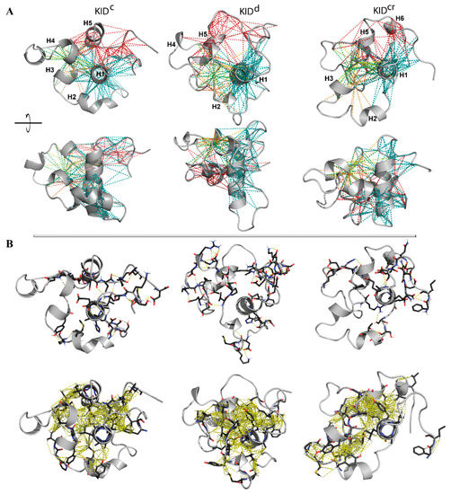 The high-occurrence of contacts between multiple residues from the folded and randomly coiled segments of the mid-domain of KIDC indicate diverse non-covalent interactions between helices (H1, H2 and H5), helices and coiled regions, and randomly coiled regions. This large number of intra-molecular contacts suggests that multiple regions contribute to maintaining the inherent (intrinsic) 3D structure of KID in all studied entities, independently of the fold.