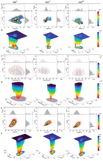 Third, for evaluation of the relative free energy () of KID, the solvent-accessible surface area (SASA) and the radius of gyration were used as reaction coordinates. Statistically, similarly to the helical content, the SASA is also represented by the unimodal Gaussian distribution, which is highly symmetric in KIDC and KIDD, and slightly asymmetric in KIDCR. The SASA and are highly correlated metrics, showing the dependence of the solvent-accessible surface from the KID size. The free energy landscape , reconstructed on these reaction coordinates, shows deep and shallow wells which are adjacent in each KID entity. In KIDC and KIDD these wells are composed of semi-compact KID conformations which are more exposed to solvent in KIDD and rather buried in KIDC. In KIDCR, the deeper well is populated by the compact and buried conformations.