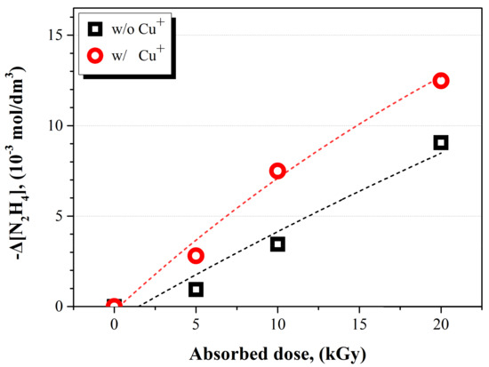 In order to investigate the effect of copper ions on the N2H4 decomposition, γ-ray was irradiated to the N2H4–Cu+–HNO3 solution and N2H4–HNO3 solution at pH 3. The absorbed dose was varied from 0 to 20 kGy, and the [N2H4]0 in the solutions was equal to 50 × [N2H4]0 in the solutions was equal to 50 × 10−3 mol dm−3. The pH of the solution was adjusted to 3using HNO3. Figure 1 shows the change in the concentration of N2H4 as a result of the γ-irradiation. The decomposed portion of N2H4 increased with the increase in the absorbed dose regardless of the presence of the Cu+ ions. This result indicates that the amount of radiolysis products of water participating in the N2H4 decomposition was enhanced when the absorbed dose was increased. At the same absorbed dose, the decomposed portion of N2H4 was higher when the copper ions existed than that when the copper ions were absent, as indicated in Figure 1. In particular, 12.48 × 10−3 mol dm−3 of N2H4 in the solution containing Cu+ ions was decomposed after the 20 kGy of γ-irradiation. When the Cu+ ions were absent in the solution, 9.05 × 10−3 mol dm−3 of N2H4 was decomposed. Moreover, the G-values for the N2H4 decomposition were calculated for 20 kGy of absorbed dose and listed in Table 1. G(–N2H4), for the solution containing Cu+ ions, was higher than that of the solution not containing Cu+ ions.