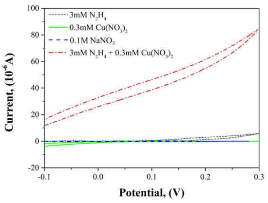 Cyclic voltammograms of 3 mM N2H4, 0.3 mM Cu(NO3)2, 0.1 M NaNO3, and 3 mM N2H4 + 0.3 mM Cu(NO3)2 solutions at scan rate of 20 mV/s. Adapted with permission from [38] Haesik Yang.