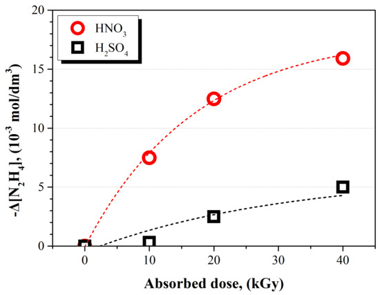 In order to investigate the anionic effect, the remaining concentration of N2H4 in the NO3− ion system was compared with that of the SO42− ion system at pH 3. Quantities of 10, 20, and 40 kGy of the absorbed doses were irradiated to each solution. The initial concentration of N2H4 in each solution was 50 × 10−3 mol dm−3. As shown in Figure 4, the decomposed concentration of N2H4 increased when the absorbed dose increased regardless of the type of acid added. At the same absorbed dose, three times higher concentrations of N2H4 in the NO3− ion system were decomposed as compared to the SO42− ion system. As indicated in Table 3, the G-value for the decomposition of N2H4 at 40 kGy was 3.98 × 10−7 mol J−1 when the acid added in the solution was HNO3. G(–N2H4) was 1.25 × 10−7 mol J−1 when the acid injected in the solution was H2SO4. From these results, we found that the NO3− ions facilitated the decomposition of N2H4 in the solution.