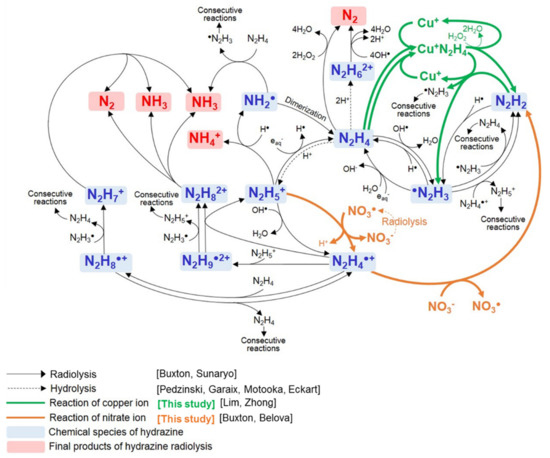 The principal decomposition reactions and rate constants of the chemical species of N2H4 in the irradiation condition are listed in Equations (5)–(23). As shown in Equation (5), N2H62+ reacts with OH● and produces N2, the end product of N2H4 decomposition at pH 1 [19].