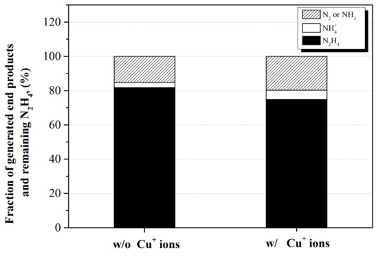 As shown in Figure 6, N2H4 decomposed into N2, NH3, and NH4+ ion. It is well known that most of NH3 reacts with H+ ions in the acidic solution and exists in the form of NH4+ [40]. Therefore, it was considered that most of the remaining gas phase end product was composed of N2 after irradiation in this study. It was judged that the NH3 was converted into NH4+ ion after the irradiation. When the Cu+ ion is present in the N2H4–HNO3 solution, N2H3● is generated, as indicated in Figure 5 and Equation (41). N2H3● participated in the reaction, generating N2 or NH3, as shown in Equations (19) and (20). Therefore, it was confirmed that the fraction of N2 and NH4+, the form of NH3 in the acidic condition, increased when the Cu+ ions were present in the N2H4–HNO3 solution, as represented in Figure 6.